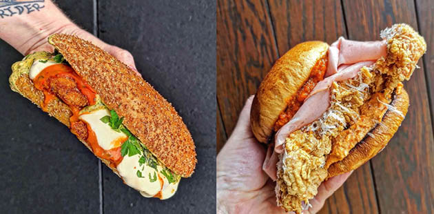 Chicken cutlet with vodka sauce, left, and fried chicken with whipped ricotta and mortadella, right