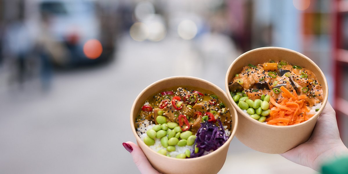 Made fresh to order, the chicken katsu includes roasted chicken on a bed of warm white rice, pickled purple cabbage, edamame, fresh chilli, spring onions and sesame seeds, topped with a katsu curry sauce. For a vegan alternative, squash and aubergine is lightly roasted and served on a bed of warm white rice, topped with pickled carrot, edamame, spring onions, sesame seeds and a creamy miso coconut sauce.