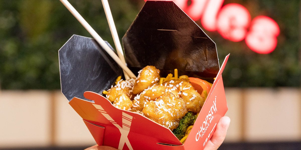 Alongside this is the bold and bright signature interiors that make Chopstix so unique. Guests can enjoy all of Chopstix’s irresistible menu favourites, such as the brand’s unique Caramel Drizzle Chicken, Sweet & Sour Chicken, and vegan favourite topping, All Leaf No Beef Teriyaki, served fresh by Chopstix Wok Masters.